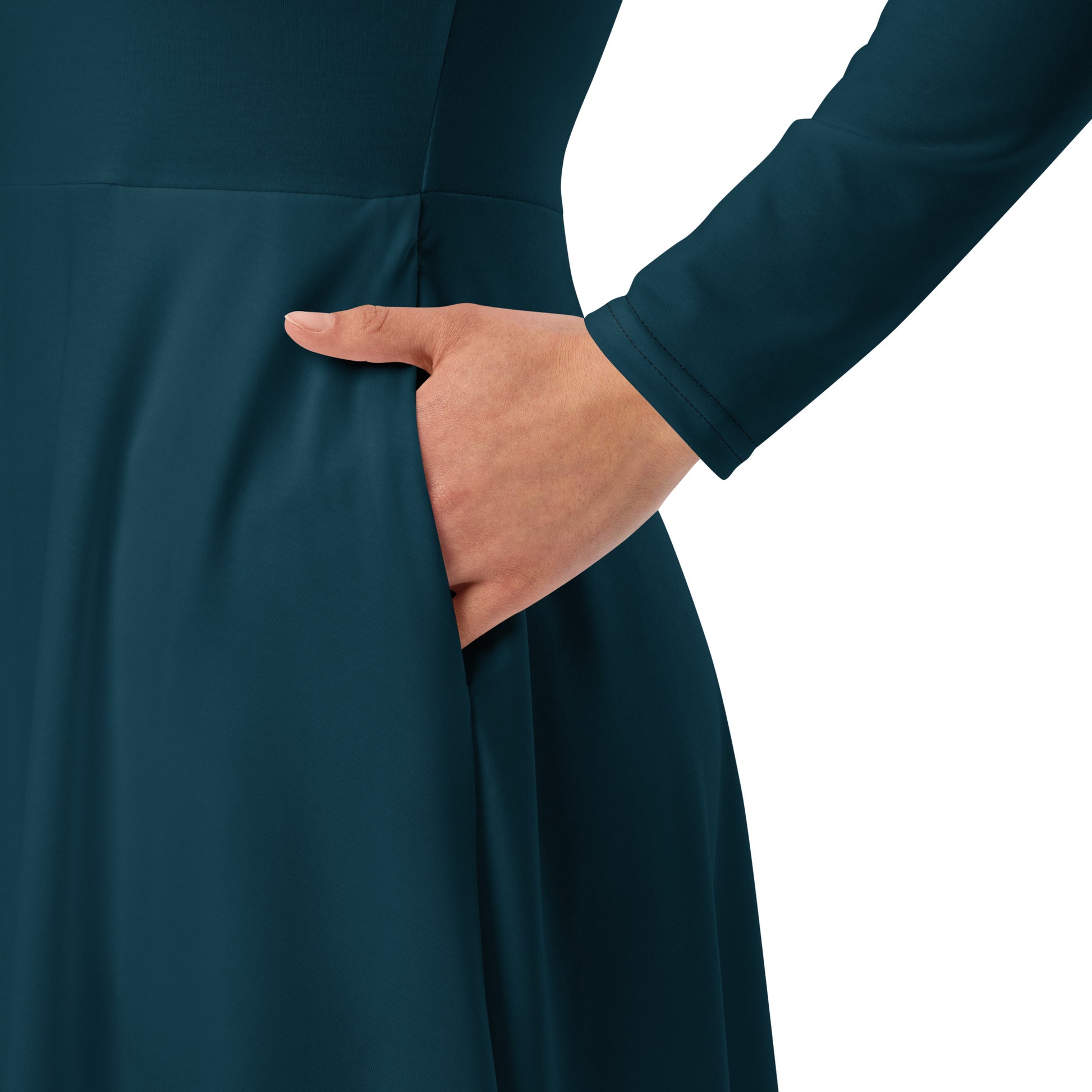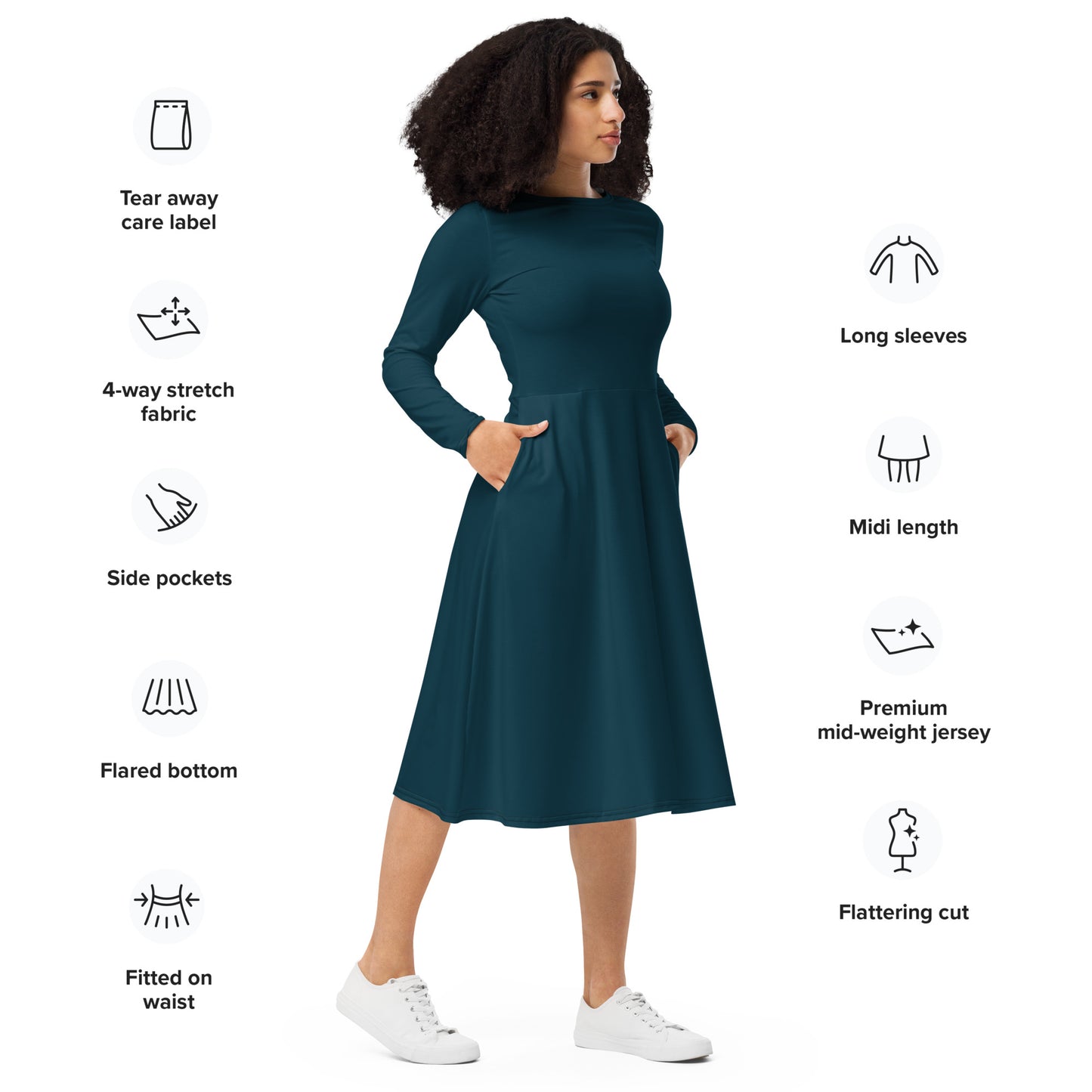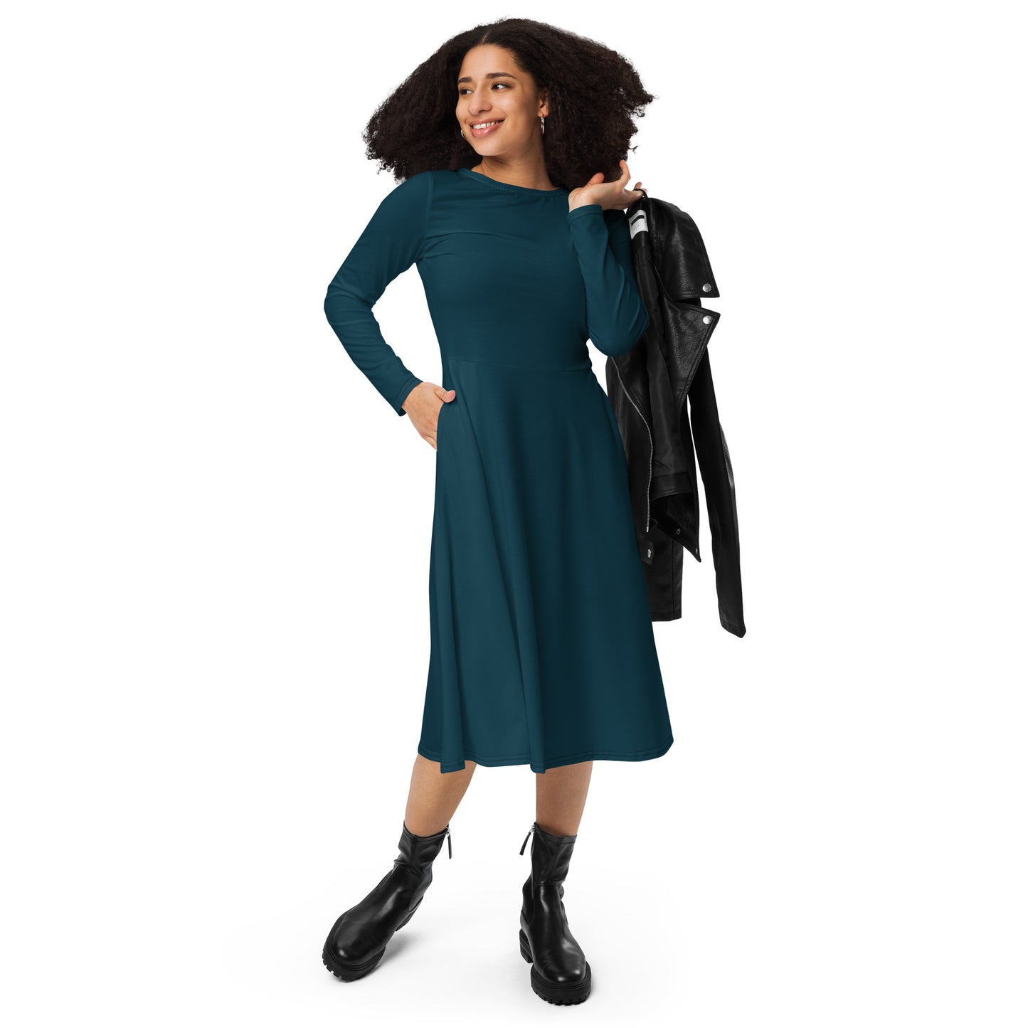 The NITRØFUEL MACHINE long sleeve midi dress is built for presence. Precision-cut with clean lines and zero distractions, it delivers structure, confidence, and comfort in one seamless design. The fitted waist and flared bottom shape the silhouette with purpose, while side pockets add real-world utility.